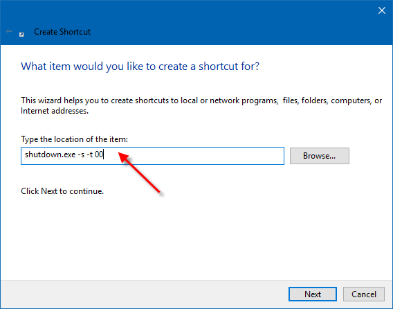 Krok 2: Vstupteshutdown.exe -s -t 00v poli umístění a potom klepněte naDalší.
