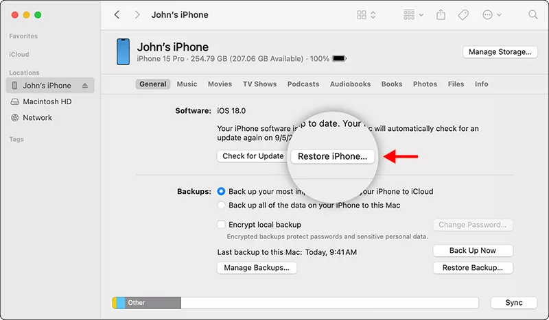 Stačí připojit váš iPhone k počítači a spustit iTunes/Finder. Po výběru vašeho iPhone klikněte naObnovit iPhonea obnoví váš iPhone na stabilní verzi iOS 18.