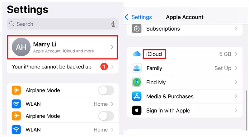 Krok 1:Chcete-li zkontrolovat, zda jsou vaše poznámky synchronizovány s iCloud, přejděte na iPhoneNastavení>[Vaše jméno]>iCloud.