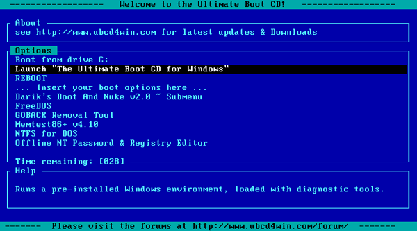 - Po vytvoření disku CD přejděte do systému BIOS a ujistěte se, že je disk CD-ROM nastaven jako první spouštěcí zařízení. Spusťte počítač pomocí UBCD4Win na CD-ROM a budete mít několik možností spouštění. Vyberte možnost „Spustit Ultimate Boot CD pro Windows“.