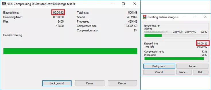 U souborů obrázků o velikosti 100 MB trvá 7Z a ZIP přibližně 2 sekundy, zatímco RAR trvá přibližně 10 sekund.