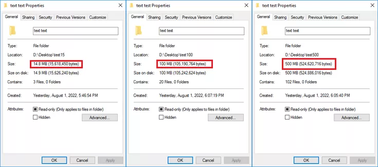 U 15 MB textových souborů jsou všechny tři kompresní formáty dokončeny přibližně za jednu sekundu, které mají malou mezeru. Pokud jde o kompresní poměr, 7Z a RAR jsou oba pouze 0,09%, zatímco ZIP je 1,4%.