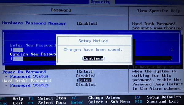Krok 3: InHeslookno, přejděte na něj stisknutím tlačítka se šipkou dolůHeslo pevného disku. HitVstupteklíč k vyskočeníPotvrzení nastavenídialog a vyberteUživatel + Master.