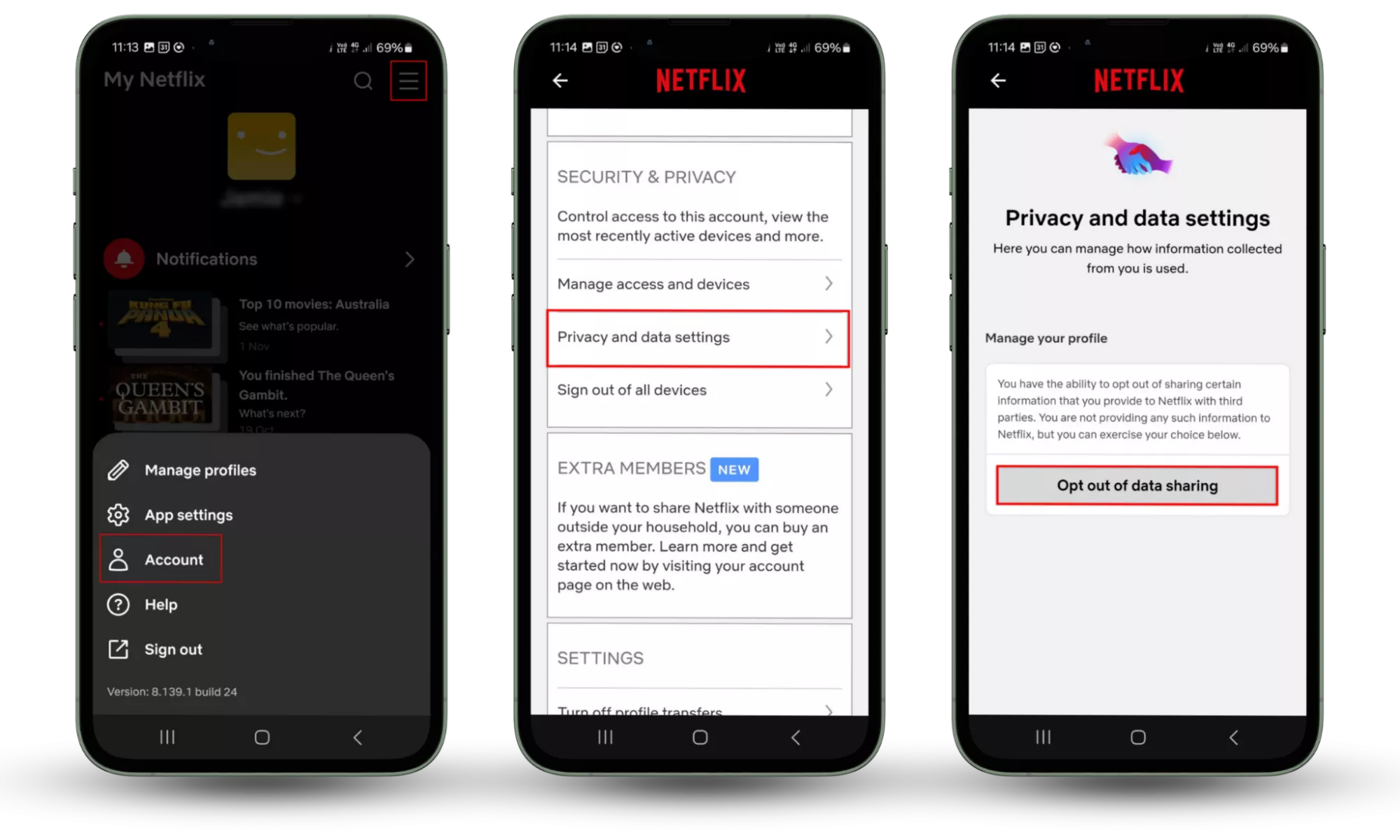 Kroky 1-3: Otevřete Netflix, stiskněte tři vodorovné čáry a vyberte Účet, stiskněte Nastavení soukromí a dat a poté vyberte Odhlásit se ze sdílení dat.Použít virtuální privátní síť (VPN)