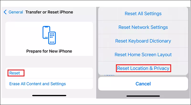 6. Obnovte nastavení polohy a soukromí:Přejděte do Nastavení > Obecné > Přenést nebo Obnovit > Obnovit > Obnovit polohu a soukromí. Tím se resetují všechna nastavení související s polohou na výchozí tovární hodnoty.