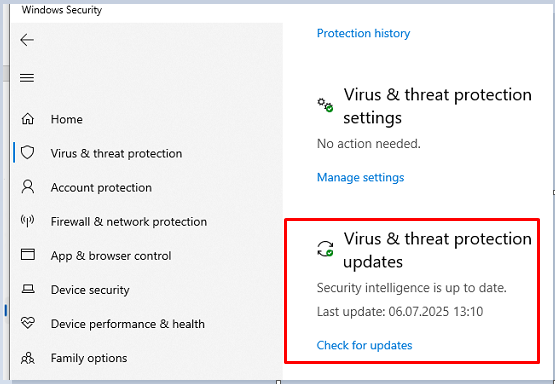 TheAktualizace ochrany před viry a hrozbamisekce zobrazuje verzi antivirové databáze a datum, kdy byla naposledy aktualizována.