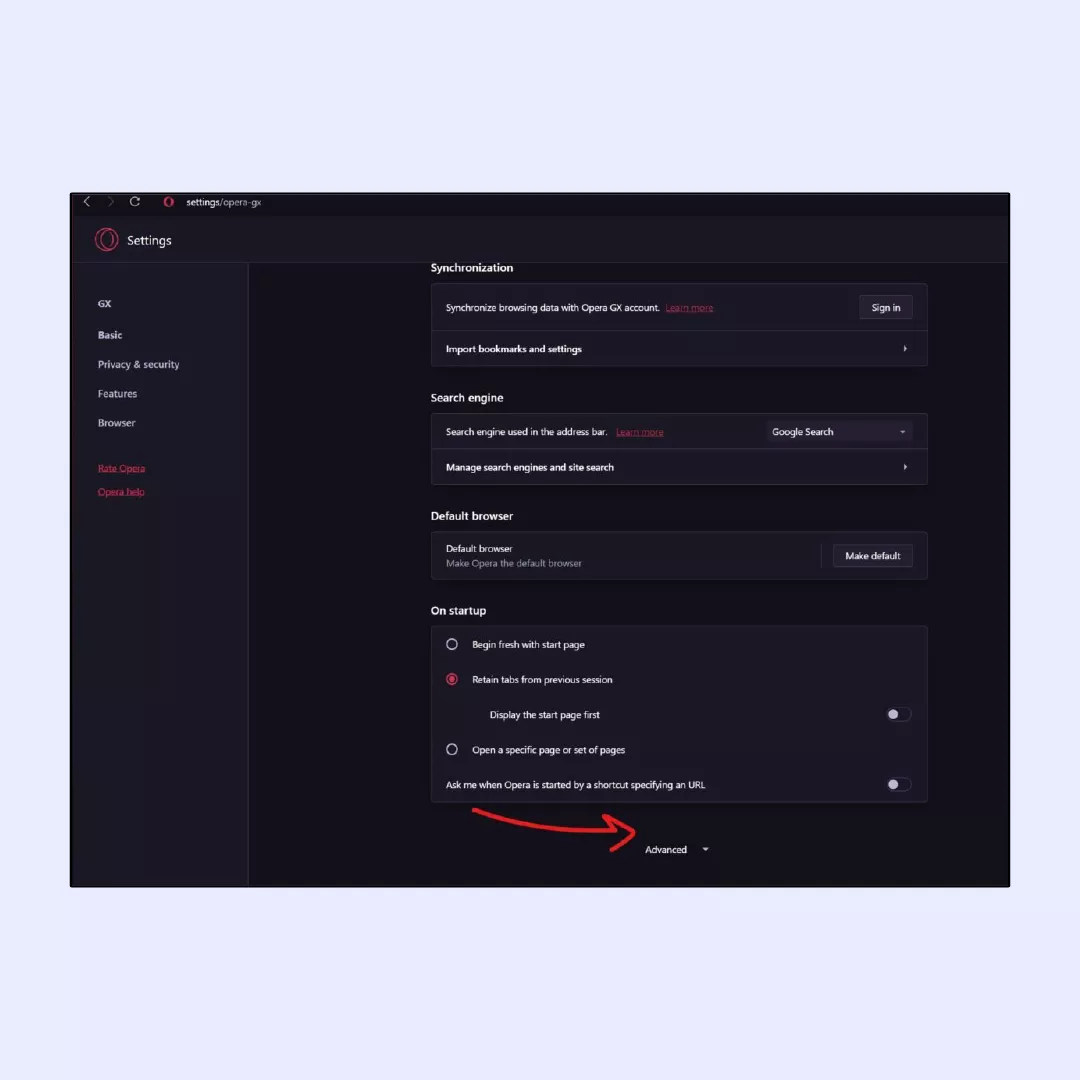 - Z nabídky vyberte „Nastavení“ a poté klikněte na „Upřesnit“ v levém postranním panelu.
