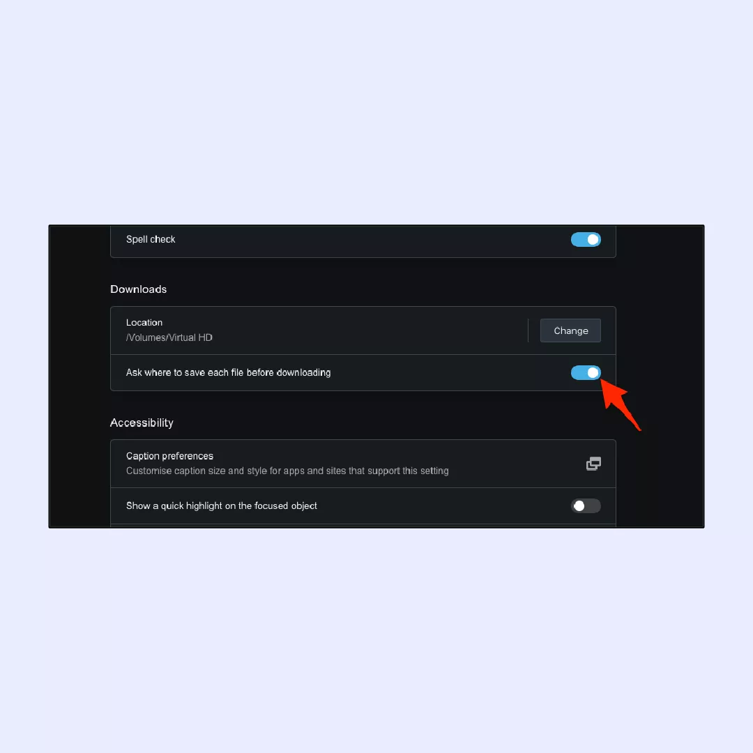 8. Přepněte na „Před stažením se zeptejte, kam uložit každý soubor“volba.