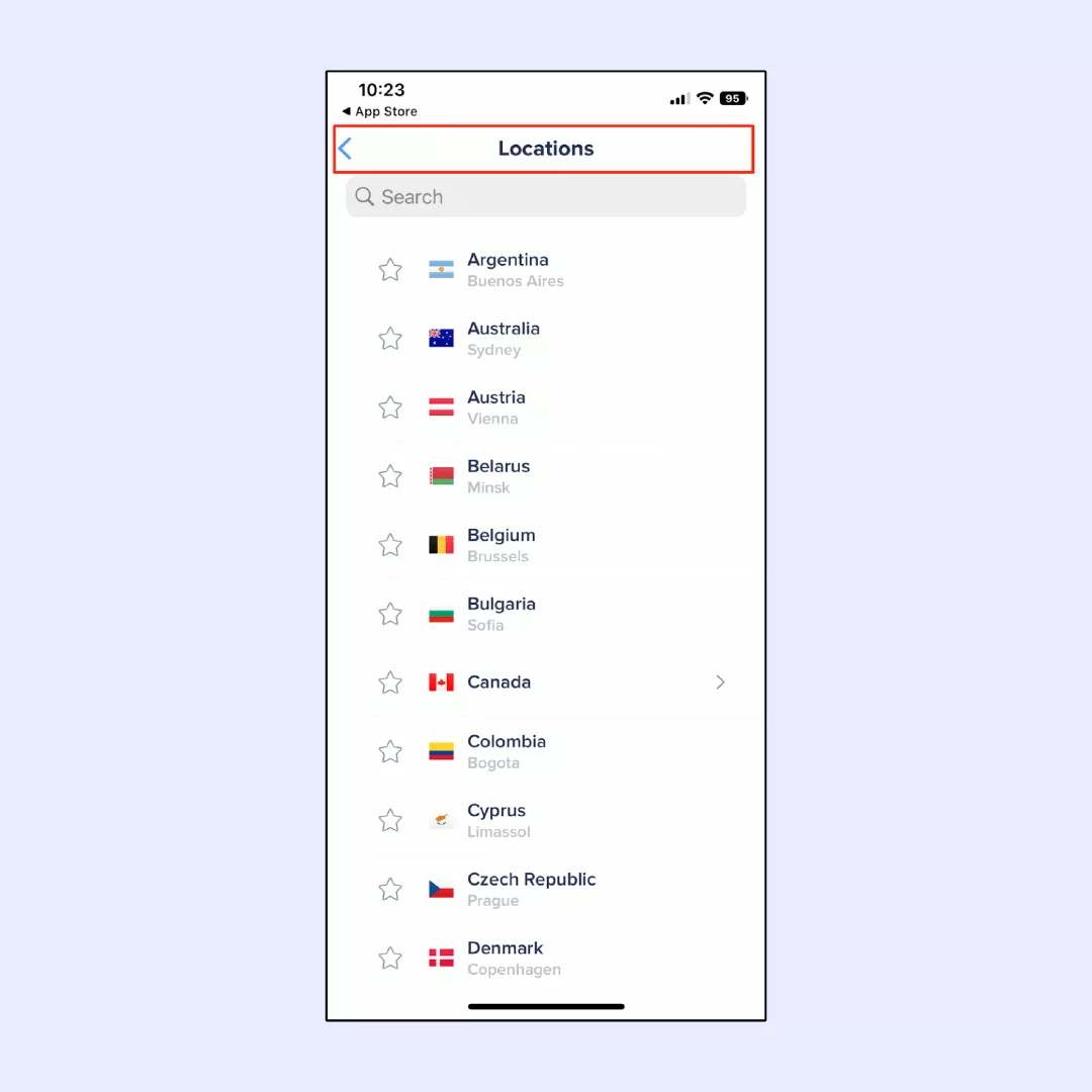 5. V aplikaci VeePN na zařízení Android vyberte optimální umístění serveru.