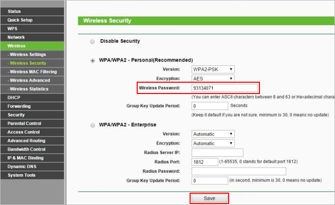 Chcete-li změnit heslo Wi-Fi, vyberteBezdrátové zabezpečenía poté zadejte své nové heslo. Ujistěte se, že již máte šifrováníWPA2zapněte a nastavte silné heslo pro vaši síť. Klikněte naUložittlačítko a odhlaste se.