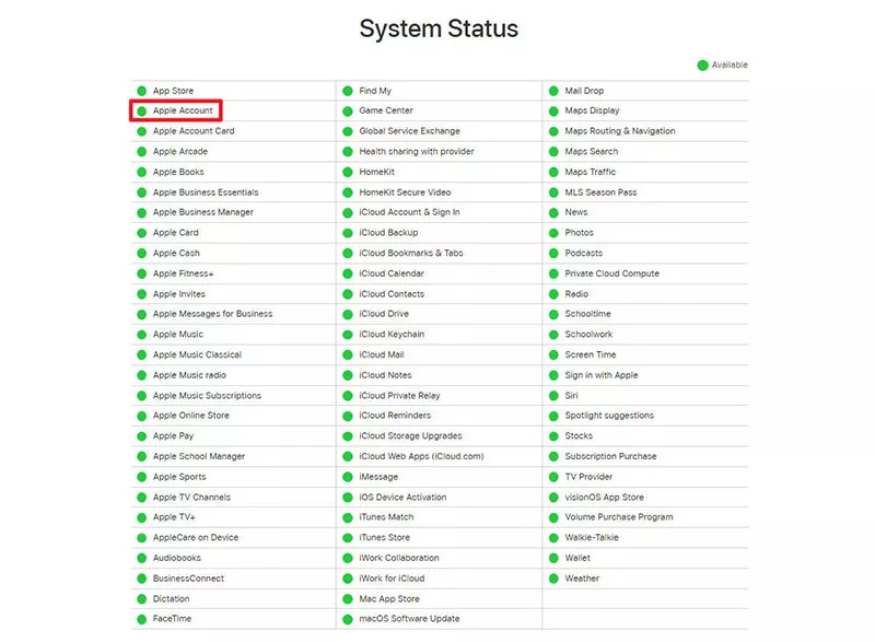 2. Zkontrolujte, zda některé služby Apple, jako je iCloud nebo služba Apple ID, nemají výpadky.
