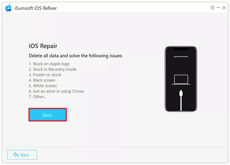 5. Klepnutím na Start potvrďte, že chcete opravit a vymazat svůj iPhone tímto způsobem.