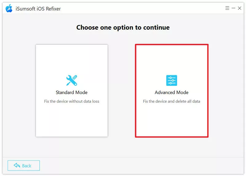 4. Vyberte Pokročilý režim (tato možnost hluboce opraví iOS a vymaže iPhone a obnoví jej do továrního nastavení.)