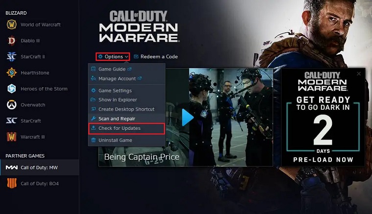 Je možné, že aktualizaceModerní válčenímůže vyřešit problém s vysokým využitím procesoru. Může také vyřešit jakékoli další základní chyby a problémy, takže je nejlepší udržovat hru aktualizovanou. Oficiální aktualizace tento problém pro většinu uživatelů nevyřešily, ale stojí za to to zkusit. Chcete-li zkontrolovat aktualizace dostupné pro Modern Warfare, postupujte podle těchto krátkých pokynů: