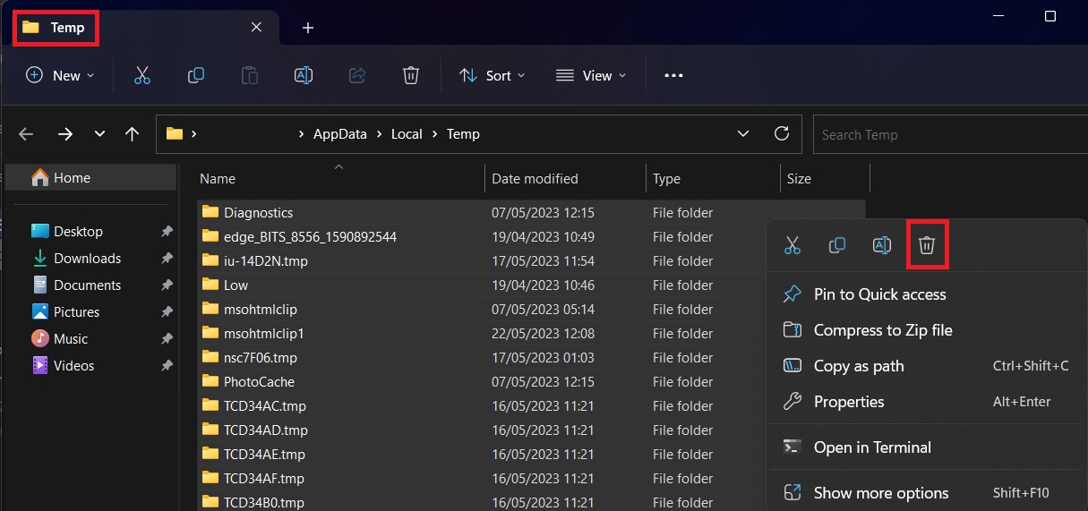 - V nově otevřenémTempvyberte složku avymazatvšechno.