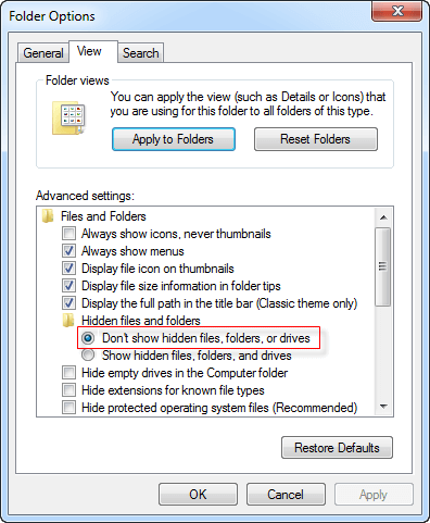 Krok 2: VMožnosti složkydialogu, vybertePohledkartu a ujistěte seNezobrazovat skryté soubory, složky a jednotkyje zaškrtnuto. Pokud tato možnost není zaškrtnutá, zaškrtněte ji a kliknětePoužítnásledujeOK.