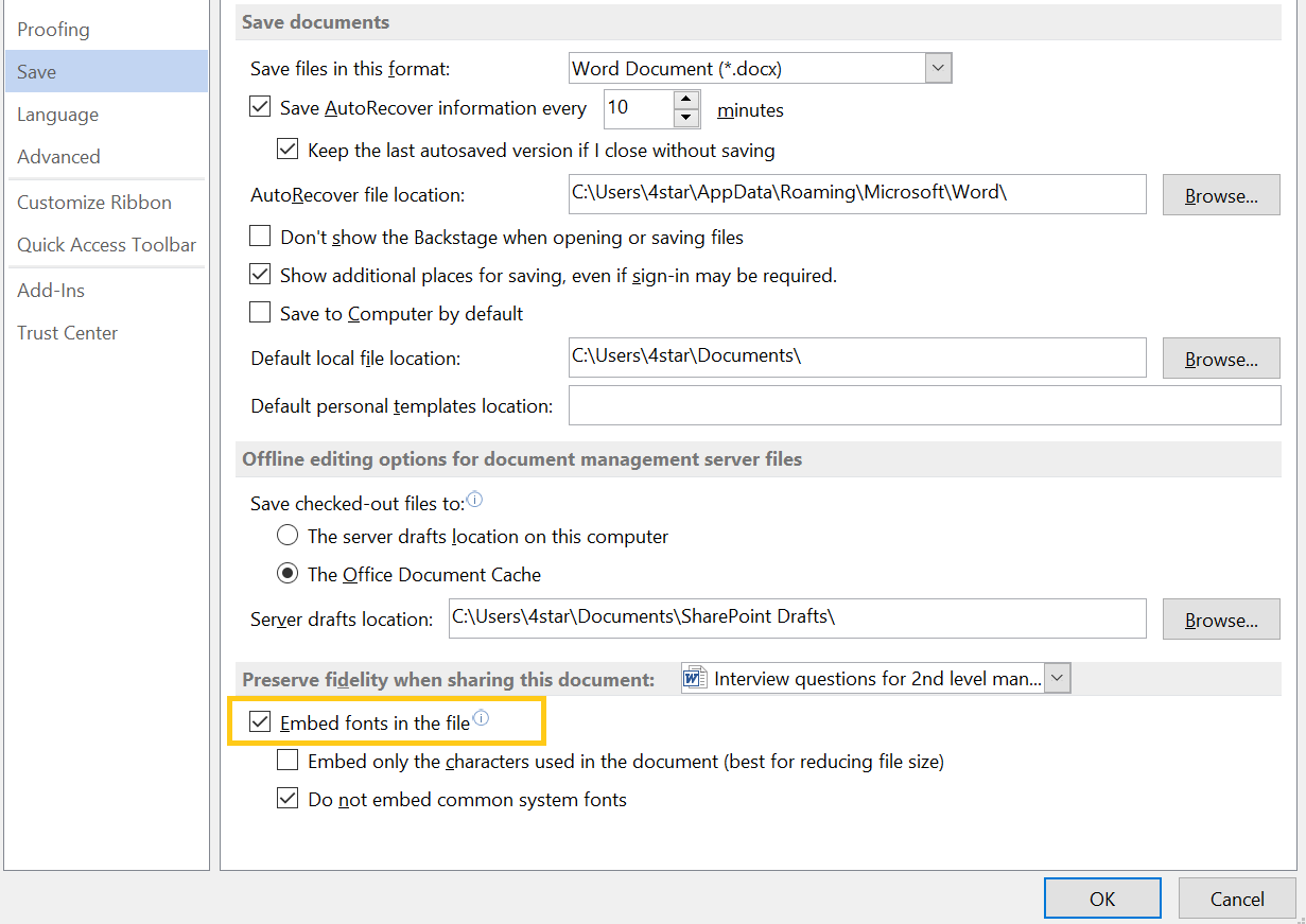 Jedním ze způsobů, jak to obejít v souboru Word nebo PowerPoint, je vložit písmo do souboru. Klikněte na nabídku Soubor, vyberte Možnosti a klikněte na kartu Uložit. Zaškrtněte políčko vedle „Vložit písma do tohoto souboru“ a poté klikněte na OK.