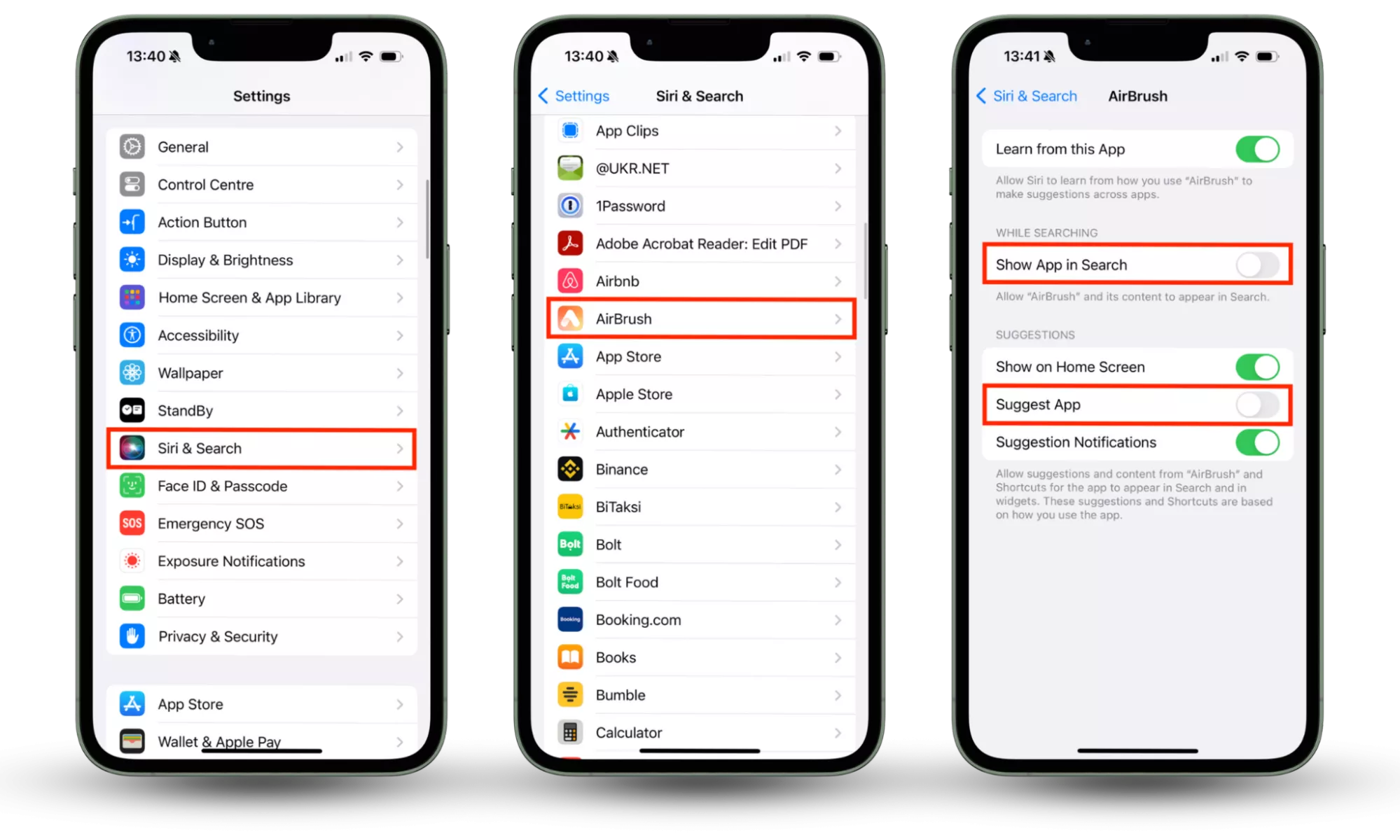 Kroky 1-3: Otevřete Nastavení > Siri a vyhledávání, poté najděte aplikaci, kterou chcete vyloučit, a vypněte Zobrazit ve vyhledávání, Zobrazit aplikaci, Navrhnout aplikaci a Zobrazit obsah ve vyhledávání.Vypnutím těchto nastavení zabráníte zobrazování aplikace, jejích dat a obsahu ve výsledcích vyhledávání. Zabrání také Siri navrhnout aplikaci na základě toho, jak ji používáte.