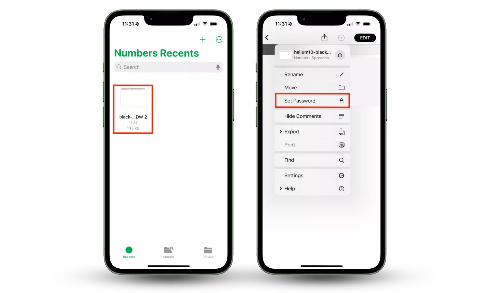 Kroky 1-4: Otevřete aplikaci Numbers, vyberte dokument, stiskněte tři tečky v pravém horním rohu a poté zvolte Nastavit heslo.Zde je návod, jak nastavit hesla u dokumentů v aplikacích Pages a Keynote společnosti Apple: