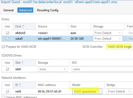 Přidejte podporu proVirtIO SCSIovladač a vyberteVirtIO paravirtualizovánomísto vmxnet3 jako virtuální síťový adaptér vModernítab.