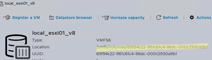- Vyhledejte soubory VM na hostiteli ESXi. Zkopírujte úplnou cestu k virtuálnímu počítači z webového rozhraní vSphere (ve formátu /vmfs/volumes/{volume_id})