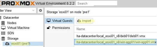 Poté vyberte virtuální počítač na hostiteli ESXi, který chcete migrovat na Proxmox, a klikněteImportovat.