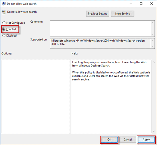 Krok 4: Vyberte možnost Povoleno a vyberte možnost z rozevírací nabídky v části „Zakázat Windows