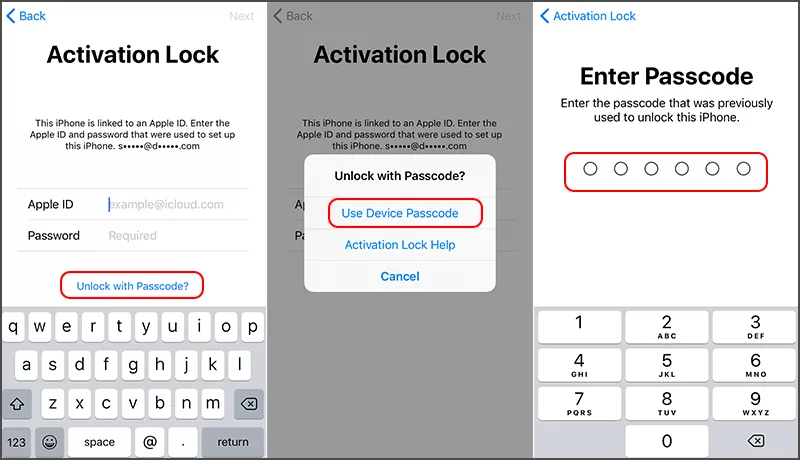 Krok 5: Po dokončení obnovy nastavte iPhone znovu. Pokud se během procesu nastavení zobrazí stránka Zámek aktivace vyžadující vaše předchozí Apple ID a heslo, vyberte Odemknout pomocí hesla a poté vyberte Použít přístupový kód zařízení. Poté zadejte přístupový kód, který byl dříve použit k odemknutí tohoto iPhone, abyste mohli zcela odstranit své předchozí Apple ID a nastavit svůj iPhone s jiným Apple ID.