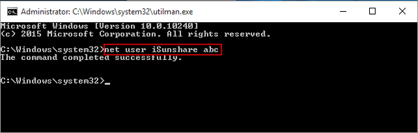 Poté můžete použít příkaz net user a resetovat heslo místního správce systému Windows 10 nebo přidat nový účet správce stejně jako v přístupném systému Windows 10.