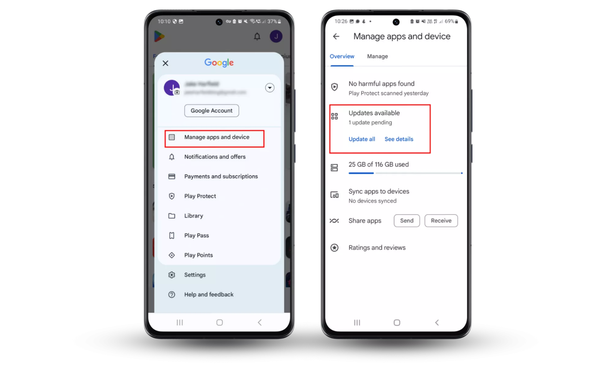 Kroky 1-3: Otevřete Obchod Google Play, vyberte svůj profilový obrázek > Spravovat aplikace a zařízení > Aktualizovat vše.7. Povolte bankovní oznámení