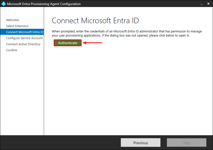 - KlikněteDalšína obrazovce Vítejte v průvodci konfigurací agenta zřizování Microsoft Entra