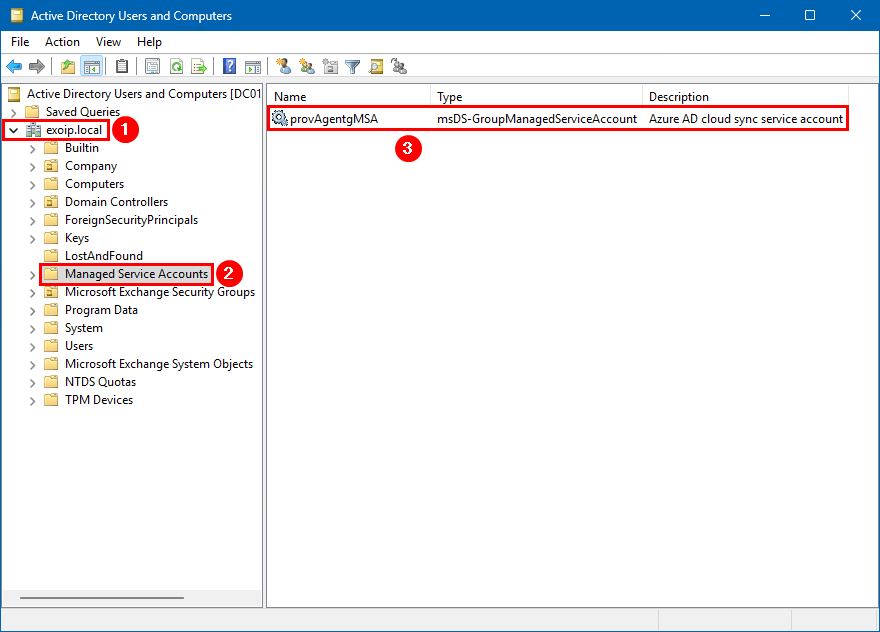 - Přejděte naDoména (exoip.local) > Účty spravovaných služeb