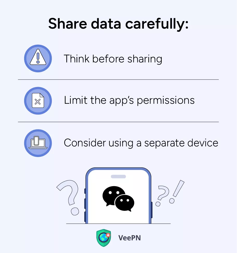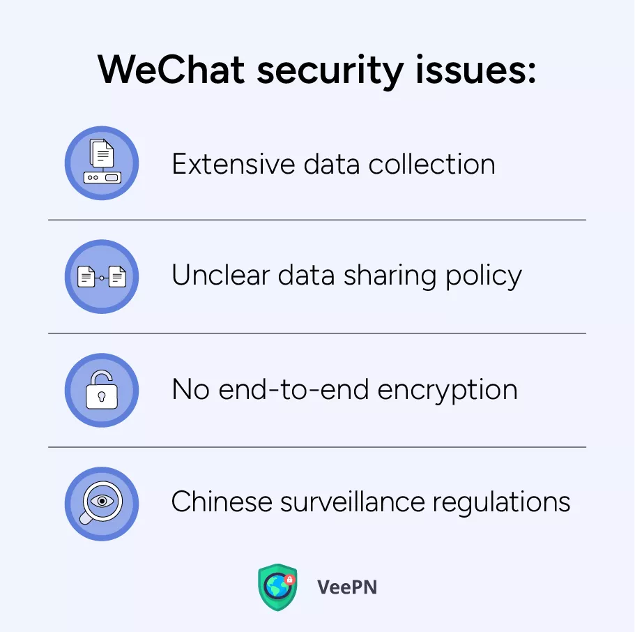 WeChat může způsobit mnoho obav o soukromí a bezpečnost, zejména pokud jde o shromažďování dat a potenciální vládní dohled kvůli dodržování čínských zákonů. Měli byste být opatrní při sdílení citlivých informací a využívat dostupné bezpečnostní funkce ke zmírnění rizik. K ochraně vašich osobních dat se také doporučuje používat spolehlivé aplikace VPN, jako je VeePN.