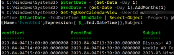 Get-MgUserCalendarView -UserId [email protected] -CalendarId "Calendar" -StartDateTime $StartDate -EndDateTime $EndDate | Select-Object -Property @{Name="EventStart";Expression={ $_.Start.DateTime}},@{Name="EventEnd";Expression={ $_.End.DateTime}},Subject, BodyPreview