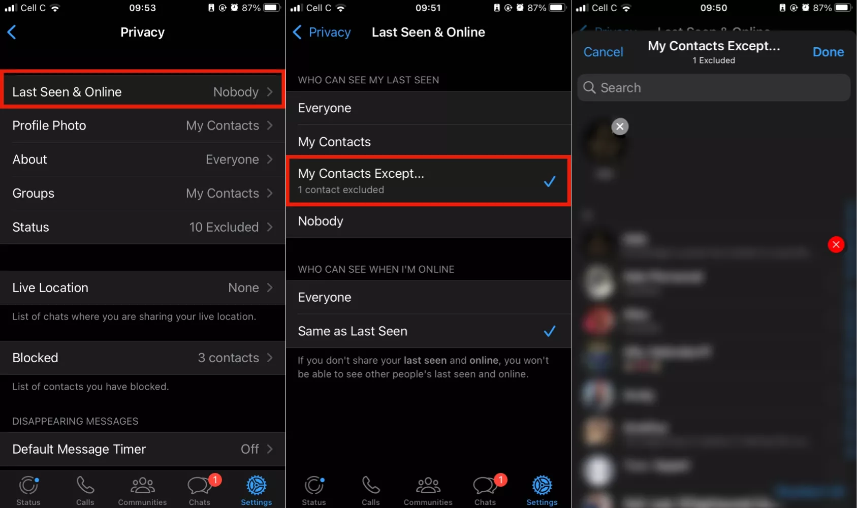 - Dále klepněte naMoje kontakty s výjimkou, vyberte kontakt svého bývalého partnera a klepněte naHotovo