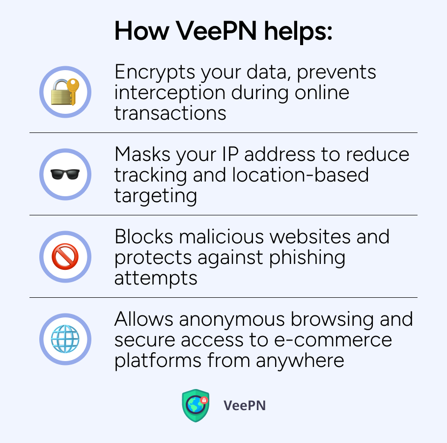 I když vaše oblíbená platforma elektronického obchodu tvrdí, že je špičková a bezpečná, hrozby mohou pocházet z mnoha úhlů, jako je phishing, sledovače třetích stran nebo přepracovaná data ze starých porušení. To je místo, kde aplikace virtuální privátní sítě (VPN), jako je VeePN, může znamenat velký rozdíl. Zde je návod, jak VeePN pomáhá: