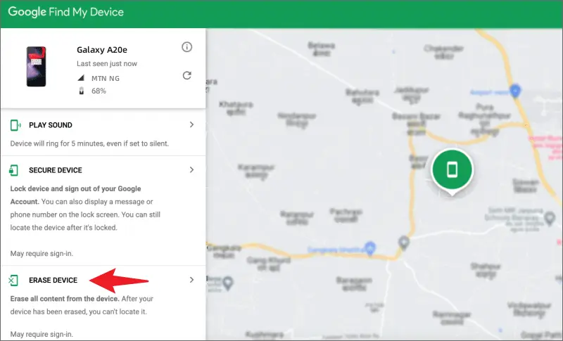 Krok 2: Přihlaste se pomocí podrobností svého účtu Google, vyberte uzamčené zařízení a klepněte na tlačítko „Vymazat zařízení“.
