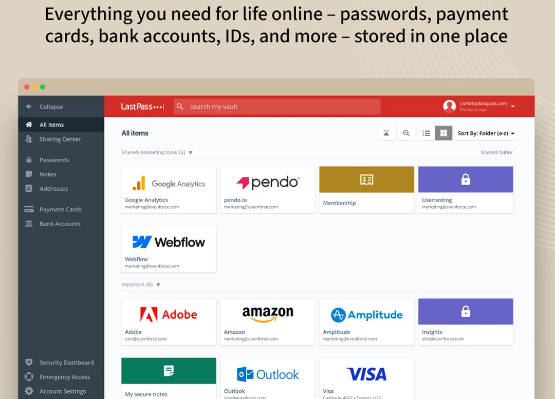 LastPass může ukládat neomezená hesla, bezpečné poznámky, adresy, kreditní karty a další v šifrovaném trezoru. Podporuje také bezpečné sdílení hesel s důvěryhodnými přáteli nebo rodinou. Rozšíření vám pomůže generovat silná, jedinečná hesla, která nahradí slabá nebo znovu použitá hesla, a tím zabezpečit vaše online účty.