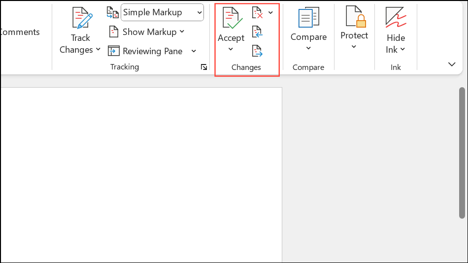 Krok 6:Přijměte nebo odmítněte změny. Stále vReviewkartu, použijteAcceptneboRejecttlačítka pro schválení nebo zamítnutí sledovaných změn. Změny můžete zpracovat jednotlivě nebo přijmout/odmítnout všechny najednou, abyste získali čistý konečný návrh.