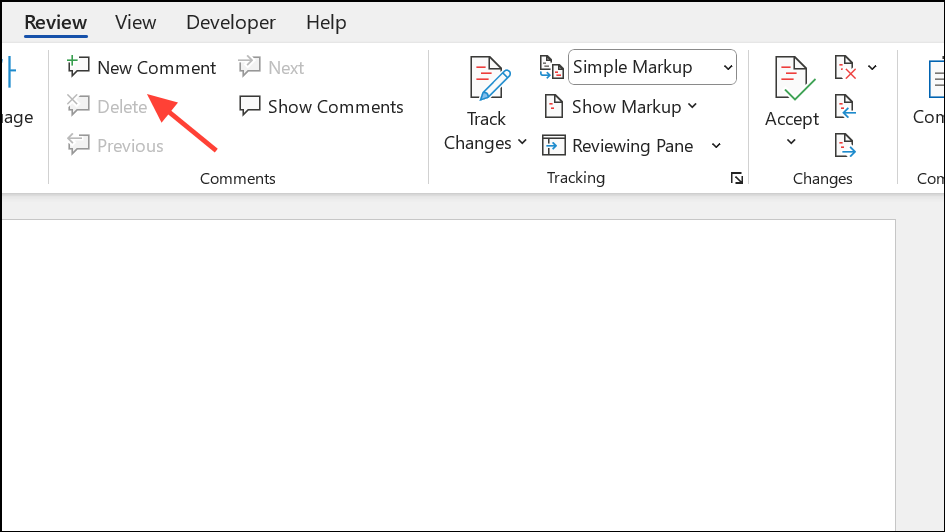 Krok 5:Sledujte změny a přidávejte komentáře. Chcete-li si ponechat záznam o úpravách, přejděte na stránkuReviewkartu a vyberteTrack Changes. Všechna vložení, smazání a změny formátování budou označeny ke kontrole. PoužitíNew Commentzanechat zpětnou vazbu nebo návrhy pro ostatní, které se zobrazí na okraji dokumentu.