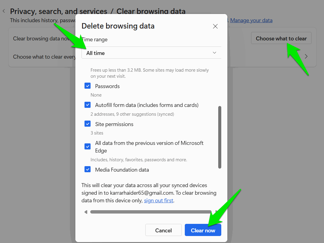 Klikněte naVyberte, co chcete vymazata vyplňte zaškrtávací políčka vedle všech možností dat. Ujistěte seCelou dobuje vybráno vČasový rozsahrozbalovací nabídka. UdeřteJasno hneda všechna vybraná data budou vymazána.
