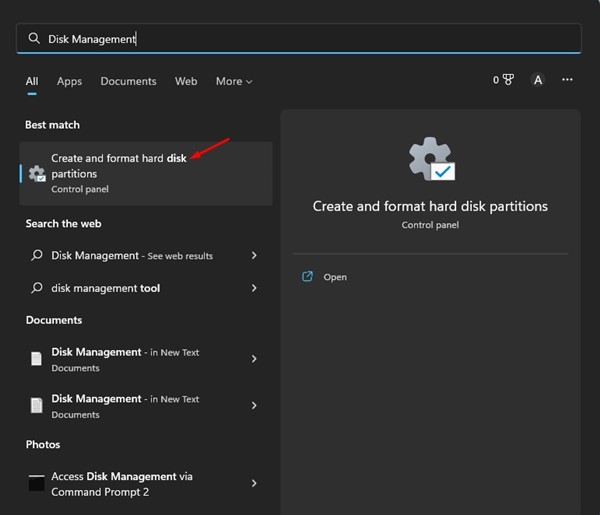 1. Klikněte na vyhledávání ve Windows 11 a zadejteSpráva disků. Dále otevřete nástroj Správa disků ze seznamu všech dostupných možností.