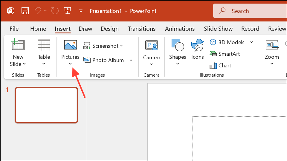 Krok 1:Vložte obrázek, který chcete převést na siluetu. Na prázdném snímku přejděte naInsertkartu, vybertePicturesa vyberte svůj soubor. Nejlepších výsledků dosáhnete, když vyberete obrázek s jasnými obrysy a jednoduchým pozadím, protože to zjednoduší proces odstranění pozadí.