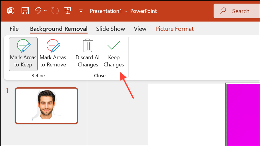 Krok 2:Vyberte vložený obrázek a přejděte naPicture Formattab. Klikněte naRemove Backgroundve skupině Upravit. PowerPoint se automaticky pokusí detekovat a označit pozadí k odstranění a zvýraznit ho purpurově.