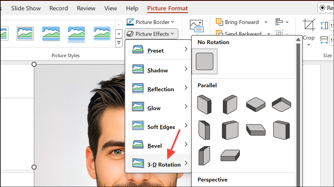 Krok 3:Aplikujte efekty 3D rotace nebo zkosení k vytvoření vrstveného nebo šikmého zobrazení siluety. Vyberte každý obrázek, přejděte naPicture Formata hledat3D Rotationmožnosti. Upravte úhel, abyste vytvořili dynamický, skládaný efekt.