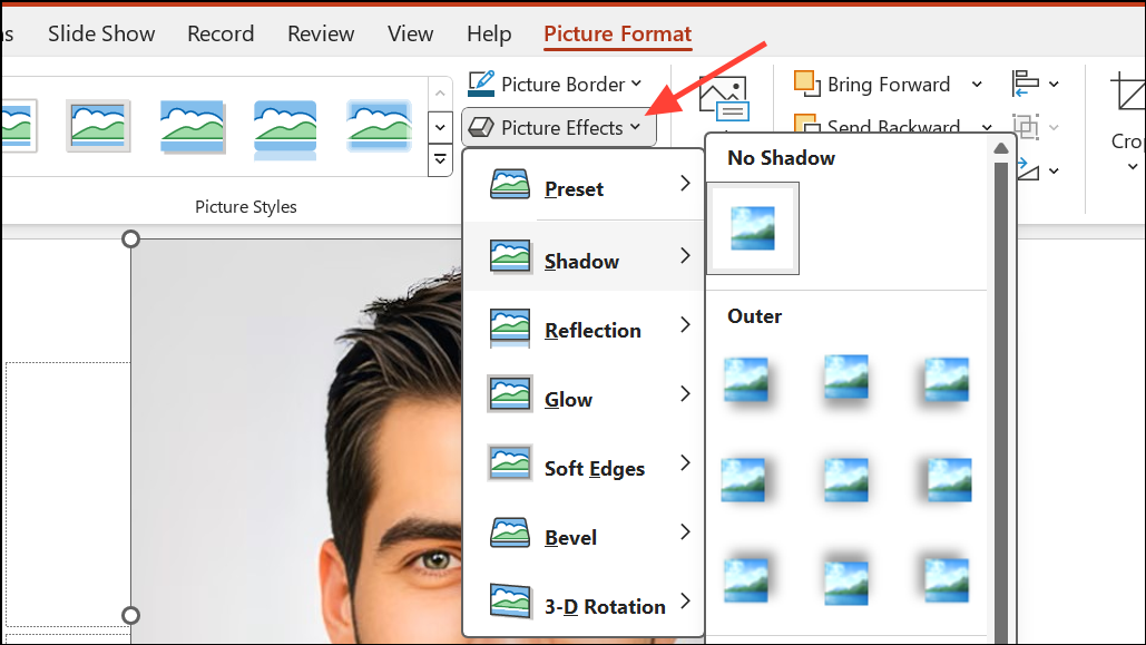 Krok 4:Přidejte vržené stíny a zarovnejte obrázky do hloubky. PoužijtePicture Effectsnabídku použítShadowa upravte jeho rozostření, vzdálenost a průhlednost. Zarovnejte obrázky přetažením nebo pomocíAlignnástroje vArrangeskupina.