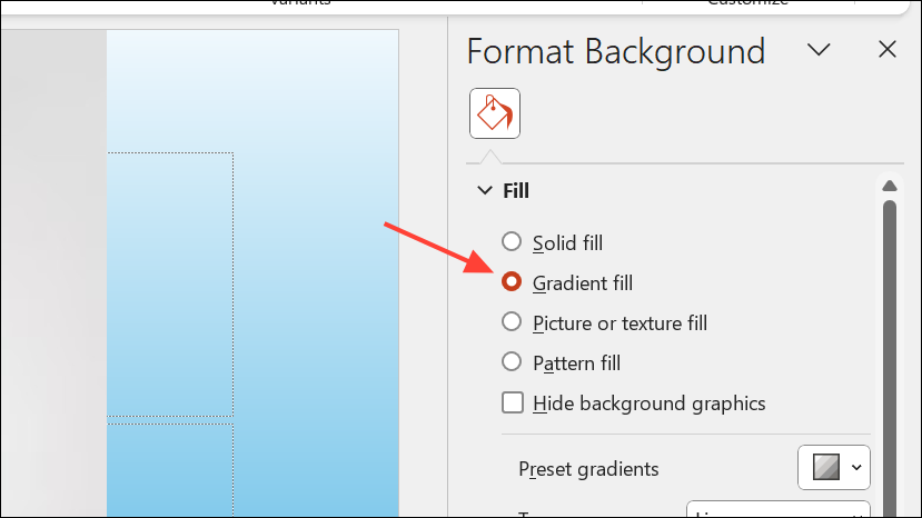Krok 5:Vyplňte pozadí snímku přechodem pro uhlazený vzhled. Přejít naDesign>Format Backgrounda vyberteGradient Fill. Vyberte si barvy a upravte směr a průhlednost tak, aby doplňovaly vaše siluety.