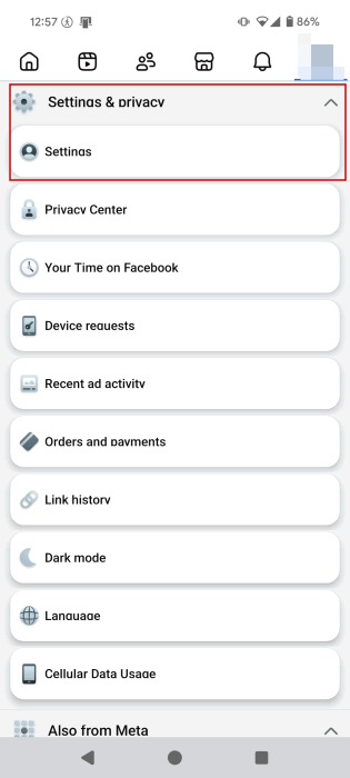 Chcete-li získat přístup k historii Facebooku, otevřete aplikaci ve svém oblíbeném prohlížeči a poté klikněte na svůj profilový obrázek v pravém horním rohu. VybratNastavení a soukromíz rozbalovací nabídky.