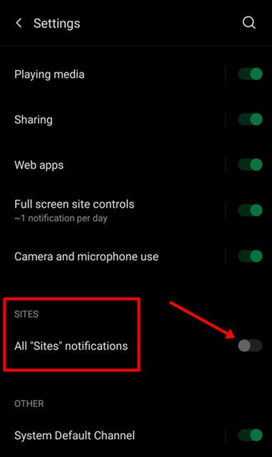 5. PodWebysekce, uvidíteZobrazit oznámenípřepnout. Zapnutím tohoto přepínače povolíte oznámení pro weby a jeho vypnutím zakážete oznámení pro web.