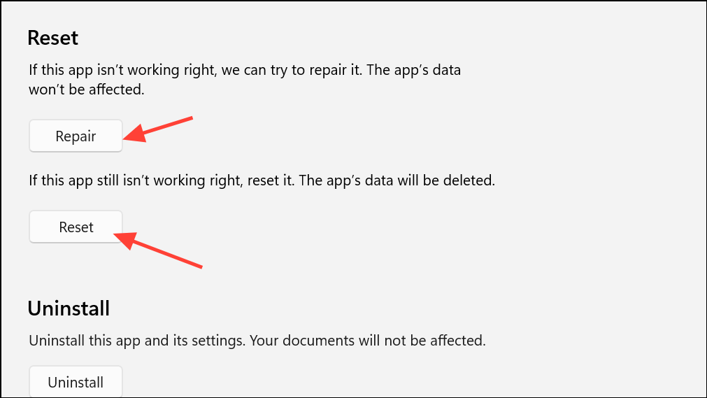 Krok 3:PodResetovatsekce, první pokusOpravit. Pokud Teams stále zobrazuje kód chyby 6, použijteResetovatmožnost úplného obnovení aplikace do výchozího nastavení.
